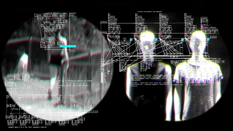 Arhitektonsko izhodišče je prostor, ki je “ovit” v videoprojekcije, znotraj prostora pa je zvočno polje, ki prehaja med različnimi oblikami harmonije/disharmonije. Predvajani videi poganjajo dinamiko generiranih zvokov, ki privzamejo naravo subtilnih zvočnih resonanc. Dodatni vir dinamike je senzor, ki zazna gibanje v prostoru in sodeluje pri zvočnih spremembah. Štiri kanalna video-projekcija in šest kanalni zvok.