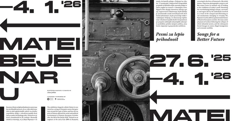 Razstava Pesmi za lepšo prihodnost, zasnovana kot niz filmskih prizorov, ki se vrtijo okoli teme dela in sledi zgodovinskih vplivov na družbenopolitično okolje v vzhodnoevropskih družbah po padcu berlinskega zidu, je prva obširnejša predstavitev umetniške prakse Mateija Bejenaruja v Sloveniji. Potem ko se je konec osemdesetih let 20. stoletja v Romuniji izšolal za inženirja, se je Bejenaru v začetku devetdesetih let odločil za študij umetnost in postal prepoznaven glas generacije, ki se je oblikovala v negotovem ozračju prihajajočega kapitalizma.