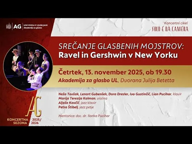 Koncertni cikel Solo e da camera:SREČANJE GLASBENIH MOJSTROV: RAVEL IN GERSHWIN V NEW YORKUČetrtek, 13. november 2025Akademija za glasbo UL, Dvorana Julija BetettaNeža Tovšak, Lenart Gubenšek, ...