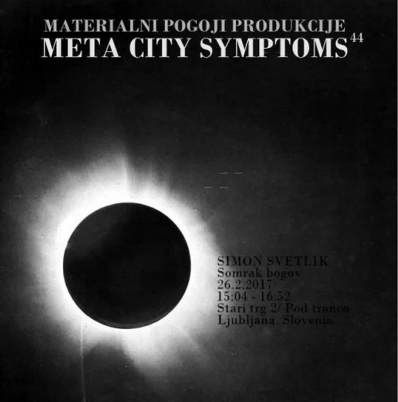 META CITY SYMPTOMS #44SIMON SVETLIK Somrak bogov / The twilight of the gods / El crepúsculo de los dioses26.2.201715:04 - 16:52Stari trg 2/ Pod trančo, Ljubljana, Slovenia