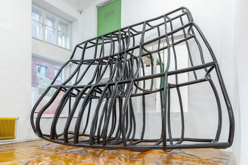Dvojna zanka. V veliko slikovno površino na podstavku, ki ga je Neja Zorzut poimenovala "Stvar", je vpisana prostorska zanka ali zasuk, v katerem se znotraj in zunaj izmenjuje glede vidnosti. ...